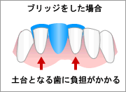 無くなった歯の前後の歯を削って土台(支台)にし、橋をかけて冠をかぶせる「ブリッジ」で治した場合、土台となる歯に負担がかかります。
