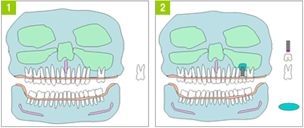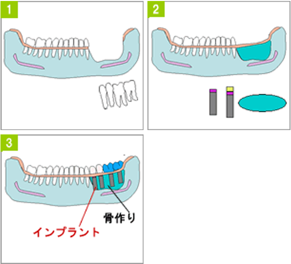 サイナスリスト インプラントを行う部位とは別の部分から上顎洞の横に穴をあけ、上顎洞の下の部分にいっぺんにたくさんの骨を作ります。同時にインプラントを行う時と骨ができあがってから別のときにインプラントを行う2通りの方法があります。