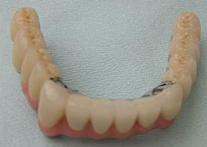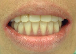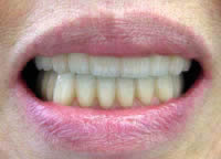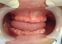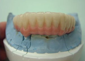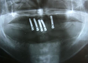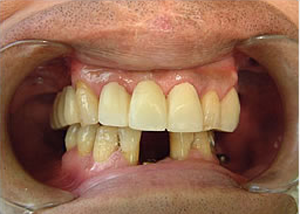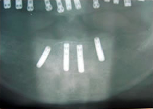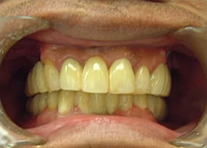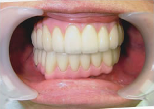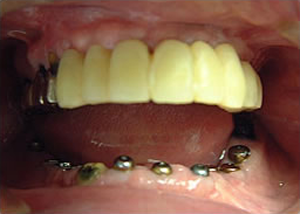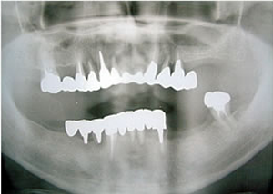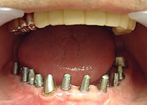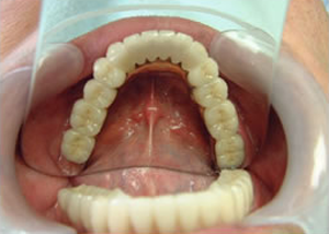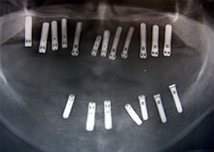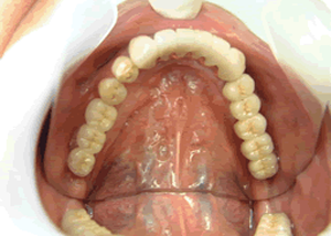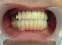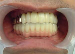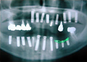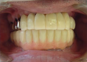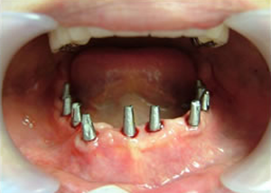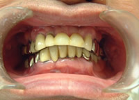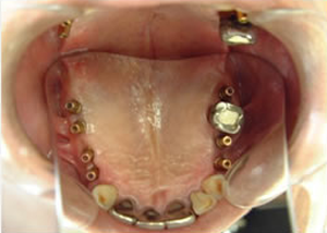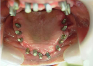 治療前 1.下11本、上1本抜歯、同時に総義歯セット 2.総義歯セット 正面口腔内 3.総義歯の入った正面観 4.抜歯後1ヶ月 術面口腔内 5.抜歯後1ヶ月 上顎前歯部5本 インプラント埋入 6.前歯部インプラント 埋入より1ヶ月 左右臼歯部8本 インプラント埋入 7.下の前歯部に4本 インプラント埋入 8.この部は薄い骨があっただけでインプラントの先端1/3を骨に埋入。あとはすべて骨を作ってあります。 上にのせた膜の中にチタンのフレームがわずかに映っています。 9.左下に3本 インプラント埋入 10.右下に3本 インプラント埋入 11.上にチタンの土台が入りました。 12.上の仕上がり上部構造3ケに分かれているが入ると一体化します。 13.3ケのパーツが一体になりました。 14.上は作った最終本物の歯が入っています。 下はチタンの土台が10本入りました。 15.下の土台は平行性あわせて削ったところです。 16.上は仕上がりが入り、下は仮歯です。 17.下の仕上がり上部構造3ケに分かれているが、入ると一体化します。 18.3ケのパーツが一体になりました。 19.下は作った最終本物の歯が入りました。 これで治療終了。 開口器を入れた口元