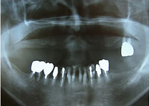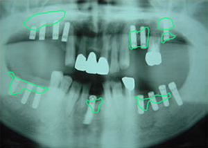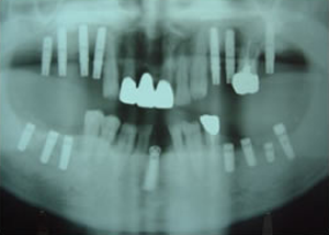 治療前 1.・骨つくり ・インプラント15本埋入 ソケットリフト サイナスリフト リッジオギュメンテーション 2.上7本インプラントに土台をつけたところ -2-口腔内写真 -2-仮歯12本入れたところ -2-仮歯12本入れたところ(正面) 3.仮歯上12本 下15本入れたところ(正面) 4.下14本最終の冠をかぶせたところ-上から(鏡) -正面-下14本の最終の冠をかぶせたところ 5.終了時レントゲン