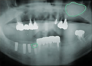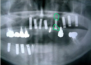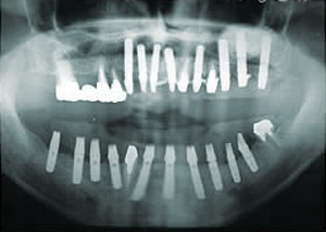 治療前 1.左上 上顎洞骨作り サイナスリフト 2.右下インプラント 一部オギュメンテーション 3.左上インプラント 4.前上インプラント オギュメンテーション 5.・左上1本抜歯 ・同時インプラント(1本埋入) ソケットリフト オギュメンテーション 6.前上から左下に6本 インプラント埋入 オギュメンテーション 7.上10本仮歯入れたところ(正面) 8.下・インプラントに10本土台をつけた口腔内 -8-上下・18本の土台のついたレントゲン所見 -8仮歯-上10本 下15本 仮歯の入った口腔内 9.模型上の最終物 10.3ケのユニットになっています。 11.最終の作った歯が入った後の口腔内 12.歯が入ったところを鏡で上から写したところ