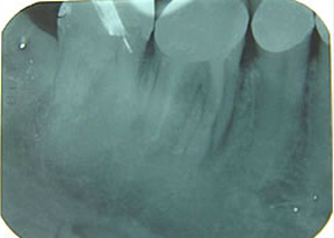 右下 第一第臼歯近心根破折 (大臼歯は歯根が二つに分かれている) 1.H18.4.12 抜歯後 (某歯科医院にて手前の歯根のみ抜歯) 2.インプラントする前 (抜歯後4ヶ月弱) 3.H18.8.22 抜いたところにインプラント埋入 (助手に鏡を持ってもらい、それを見ながら埋入) 4.紺屋の白袴中 5.インプラントに支台を入れたところ 6.上部の冠をつけたところ 7.大臼歯を2個の歯に分けて入れました。 良好に使用中 症例3タイトルへ
